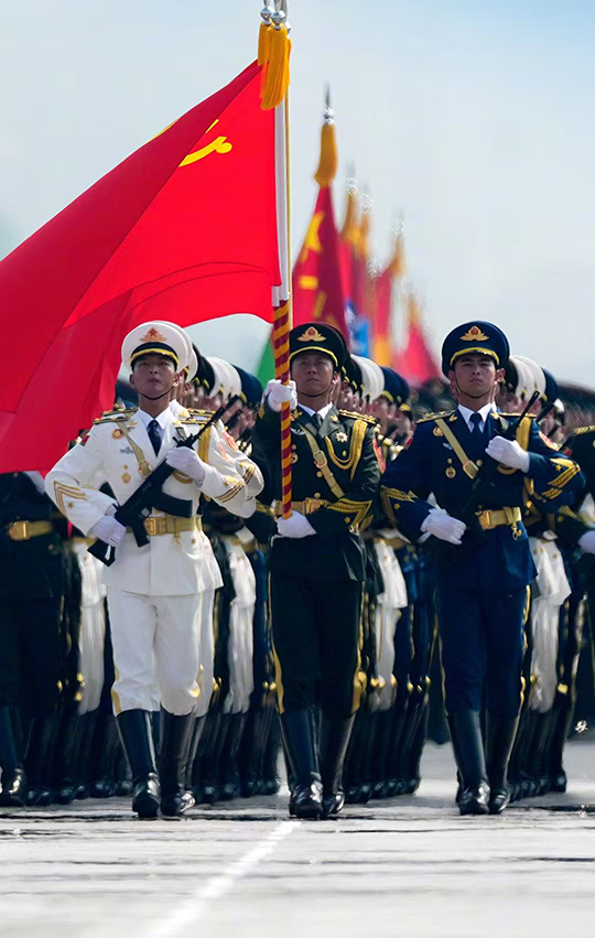 La ora 10 dimineața, la începutul paradei militare, a fost sunat imnul național solemn, iar toți participanții s-au ridicat spontan pentru a aduce omagiu. Pașii îngrijiți ai formațiunilor de picior, echipamentul sofisticat al coloanelor de armament și eșaloanele aeriene maiestuoase au șocat profund pe toată lumea, arătând îmbunătățirea puterii de apărare națională a Chinei. Afișarea a 80 de steaguri de onoare ale unităților de eroi de război anti-japonezi i-a făcut pe oameni să realizeze, de asemenea, cât de greu a fost câștigată victoria.